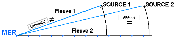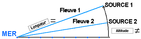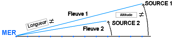 La pente dépend de la longueur du fleuve et de l'altitude de la source.Voici 3 exemples pour lesquels la pente du fleuve 1 est toujours la plus forte :